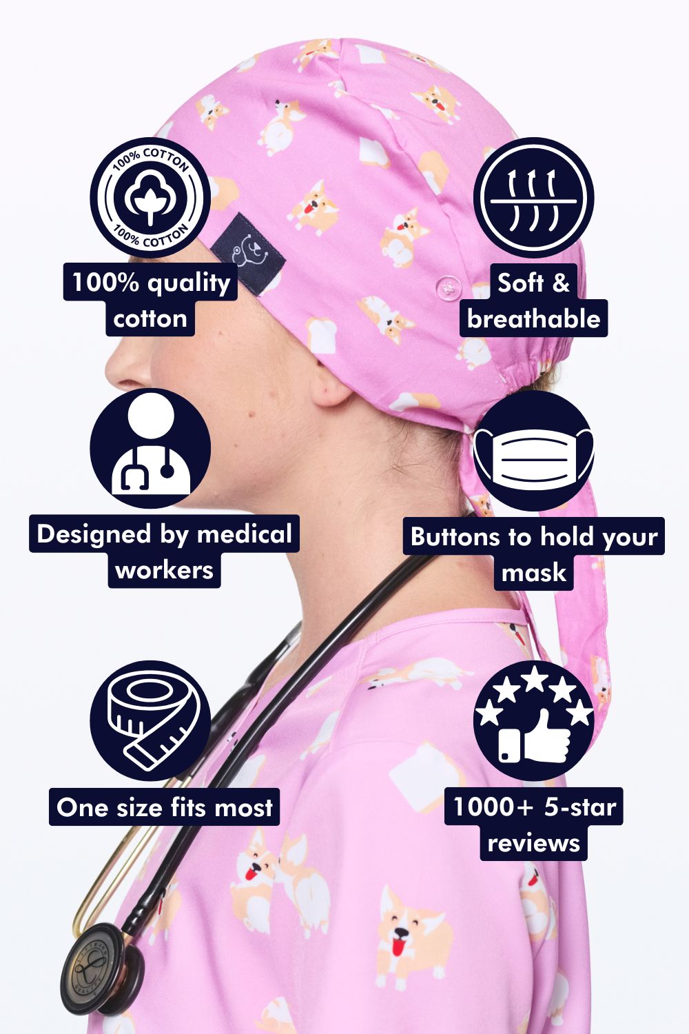 Love this scrub cap! I have a very small head and it doesn’t appear overly large on me which is fabulous. I absolutely love the mask holding buttons. Highly recommend!