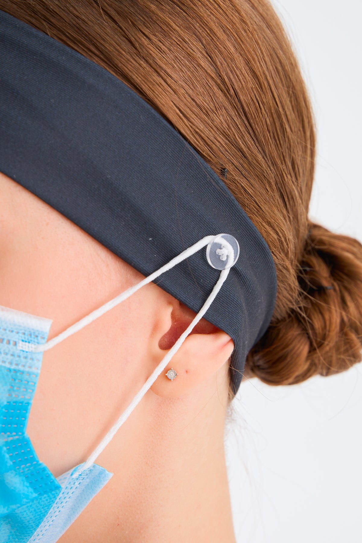 Nail that polished, professional look in a comfy, sweat-wicking headband featuring buttons to hold your mask and save your ears.