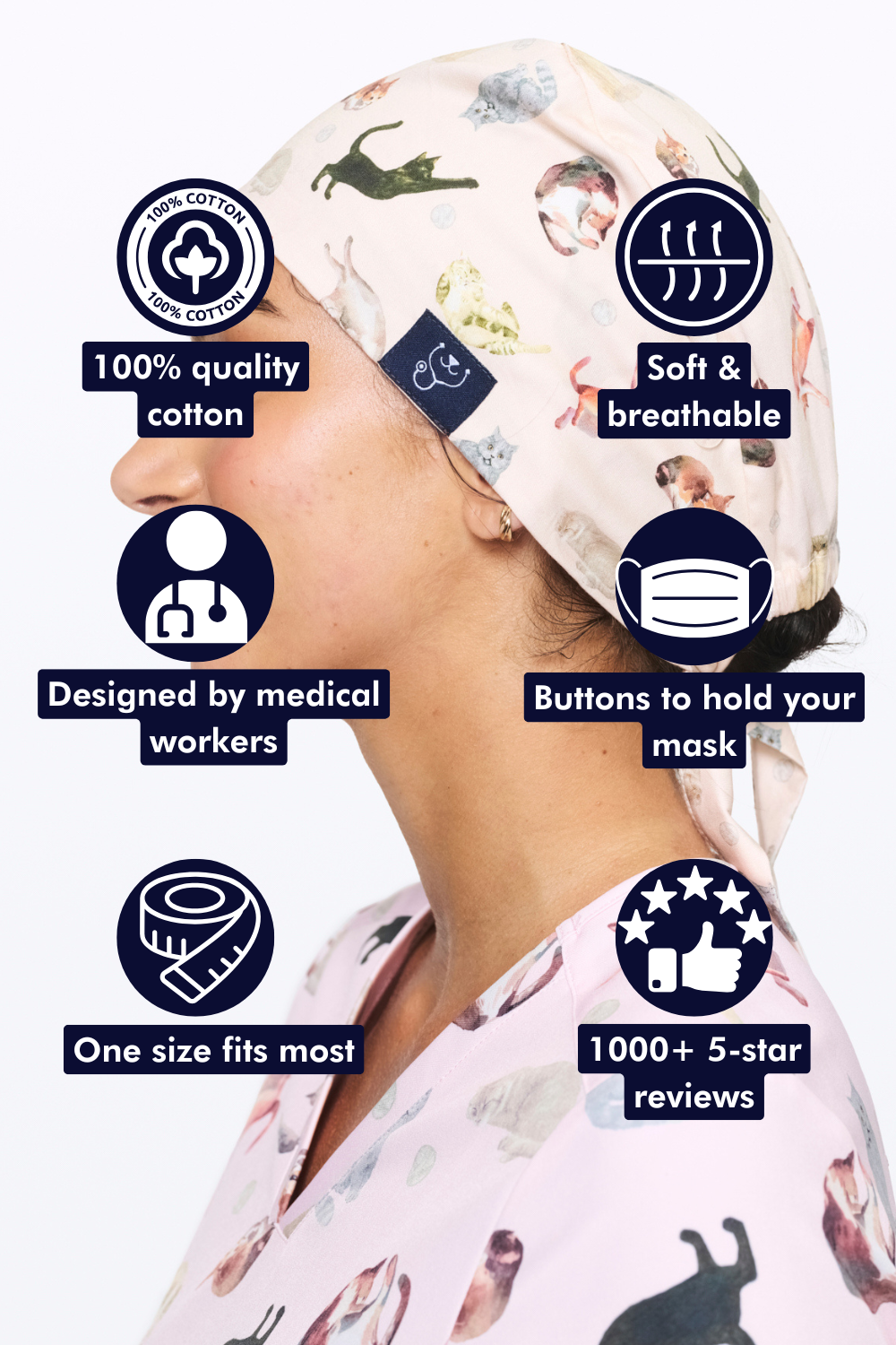 Love this scrub cap! I have a very small head and it doesn’t appear overly large on me which is fabulous. I absolutely love the mask holding buttons. Highly recommend!