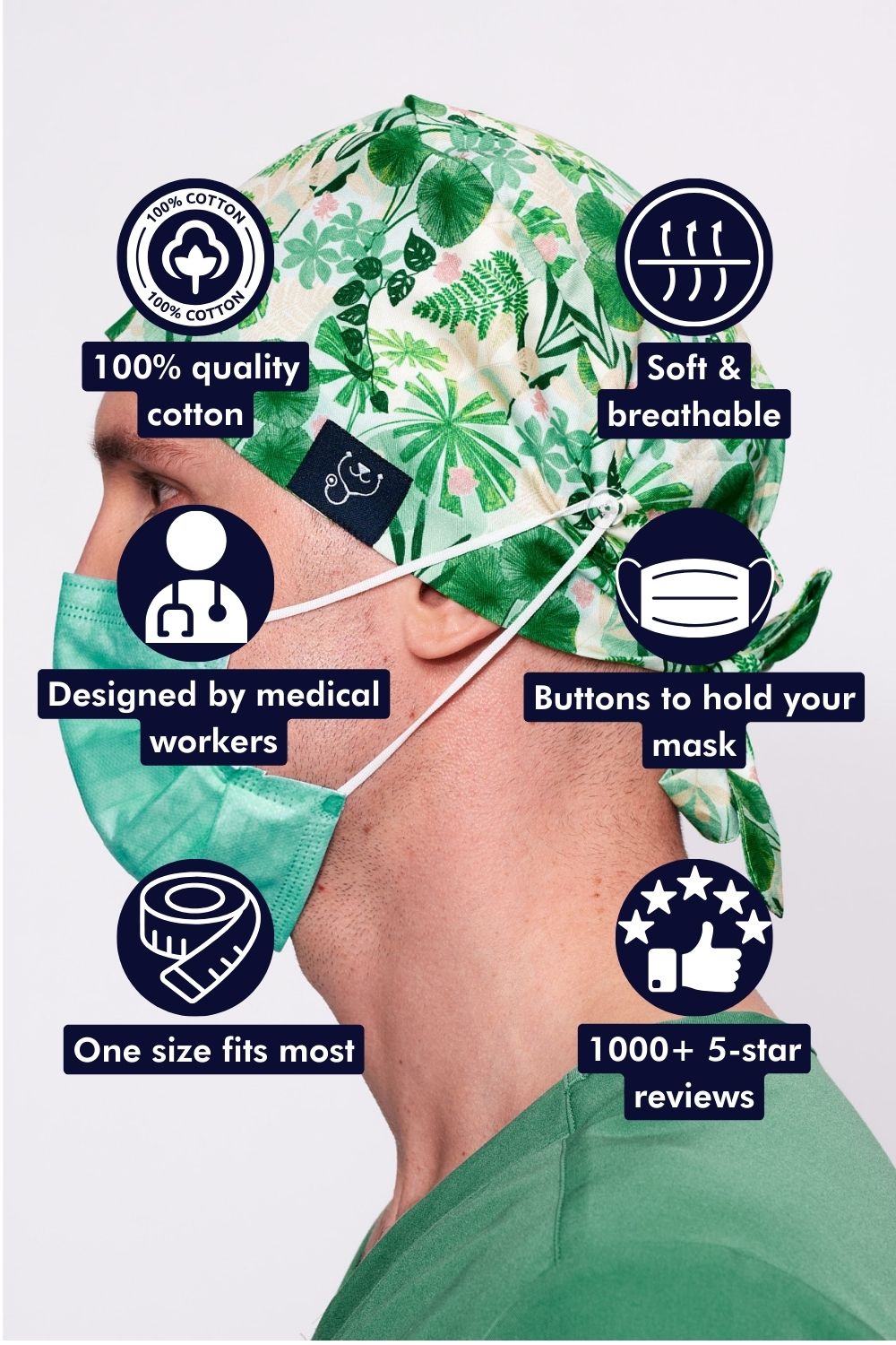 This breathable, 100% cotton scrub cap is a homage to Daintree National Park – one of the world’s oldest rainforests. Can you spot the king ferns, fan palms, adansonii leaves, idiot fruit, Daintree gardineas and native ginger?