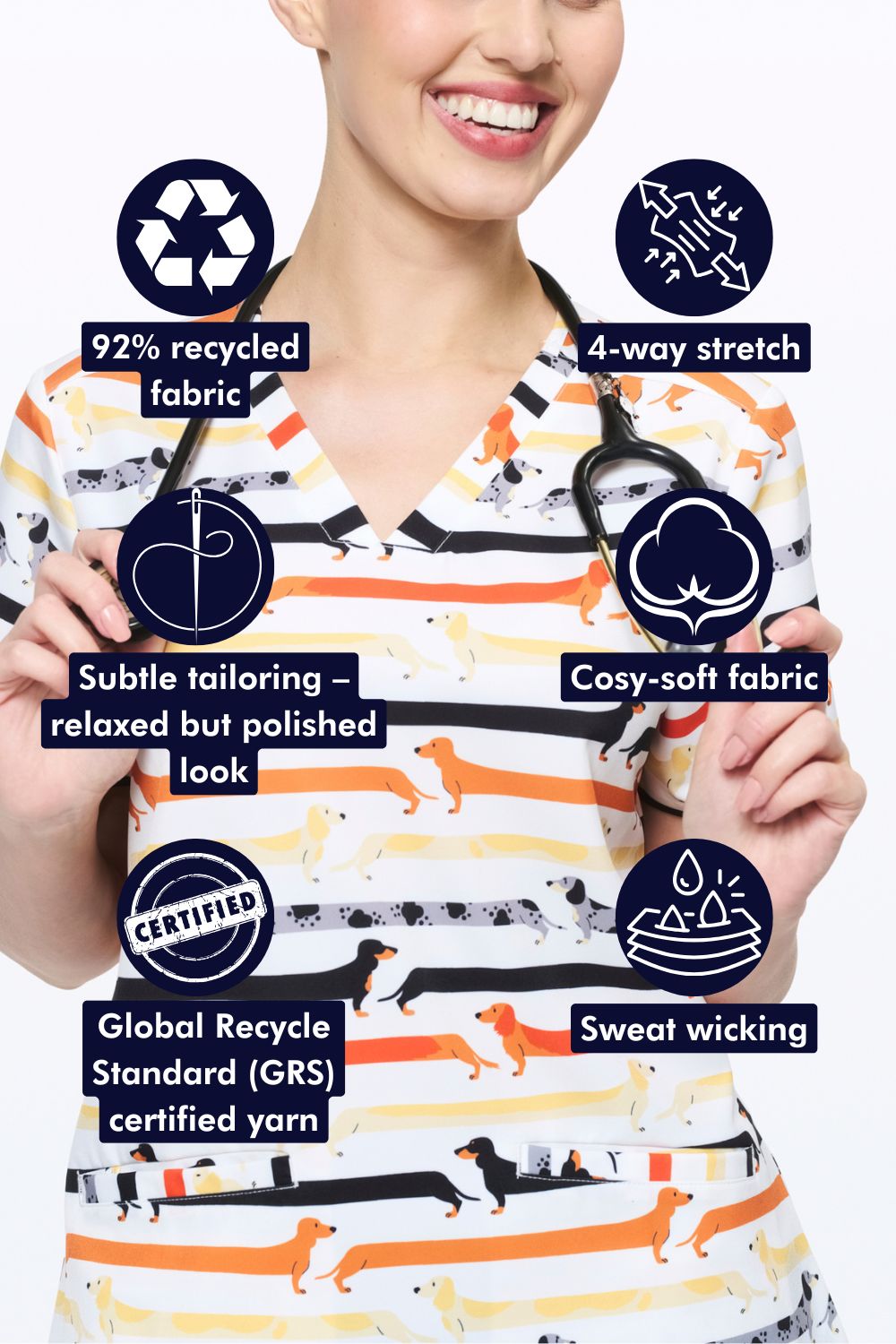 A long dog scrub top that makes long shifts feel better.