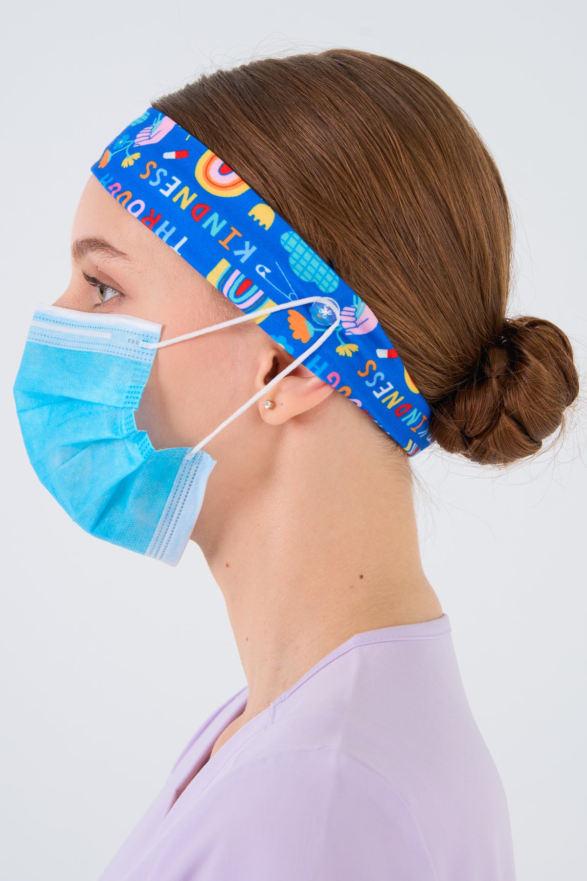 Nail that polished, professional look in a comfy, sweat-wicking headband featuring buttons to hold your mask and save your ears.